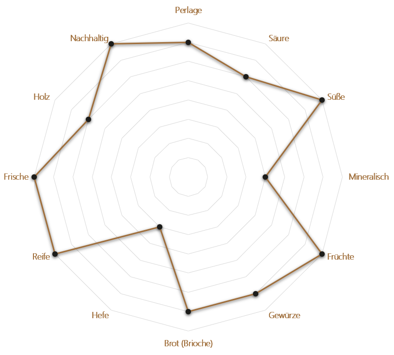 Kräftige gelbe Farbe mit goldenen, klaren und brillanten Reflexen sowie sehr feiner Perlage.